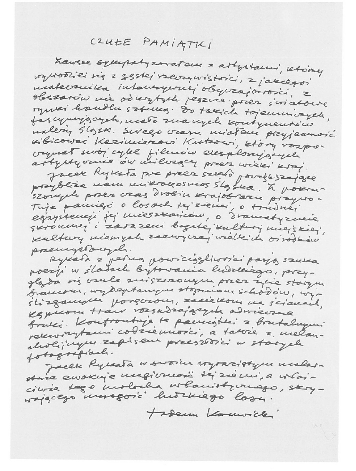 Jacek Rykała przez szkło powiększające przybliża nam mikrokosmos Śląska. Z pokruszonych przez czas drobin krajobrazu przywołuje pamięć o losach tej ziemi, o trudnej egzystencji jej mieszkańców, o dramatyzmie skromnej i zarazem bogatej kultury miejskiej, kultury niemych zazwyczaj wielkich ośrodków przemysłowych.