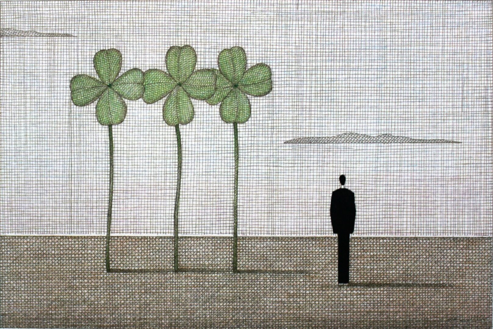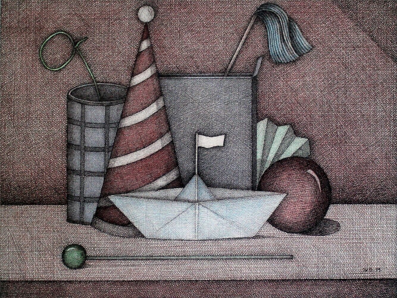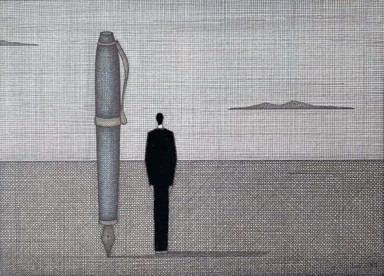 Niekiedy wdzięcznym graficznie motywem jest kostka do gry, ogromniejący ślimak albo po prostu pusty pokój. Co dziwne, mimo iż postać owa zagadkowa stanowi swoisty znak firmowy artystki, identyfikujący większość prac i potwierdzający ich tożsamość, nikt jak dotychczas nie zwrócił na niego uwagi. A przecież jest to postać kluczowa. Czyż nie stanowi alter ego autorki? Można się zastanawiać, na ile stworzona w pełni świadomie, a na ile intuicyjnie… Owszem zdarzało mi się pytać artystkę, w jakim stopniu rysunki czy grafiki są wcześniej „zaprojektowane”, a w jakim stopniu „spływają” tuszem na papier spontanicznie. Odpowiedzi tak do końca nie uzyskałem.