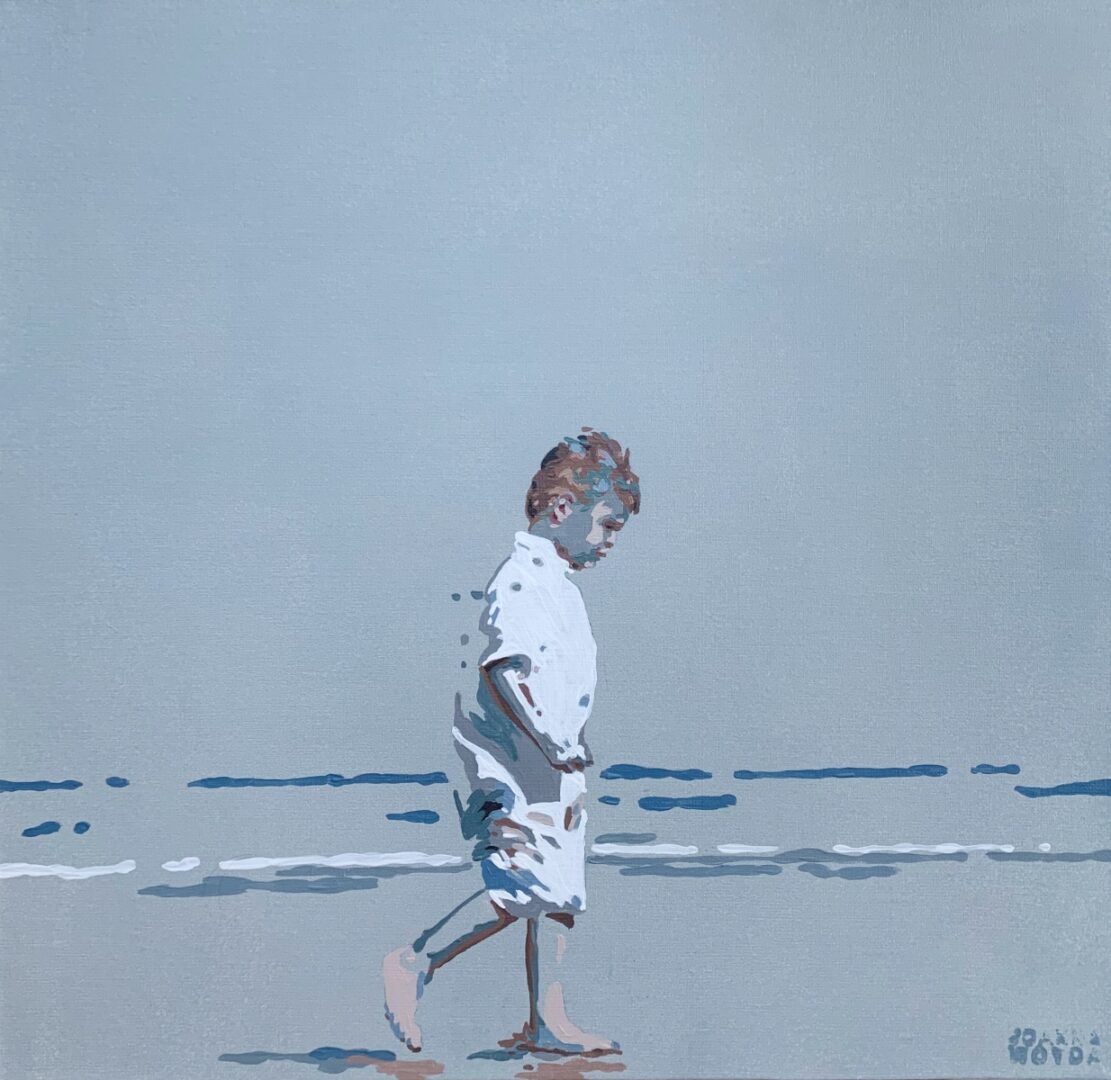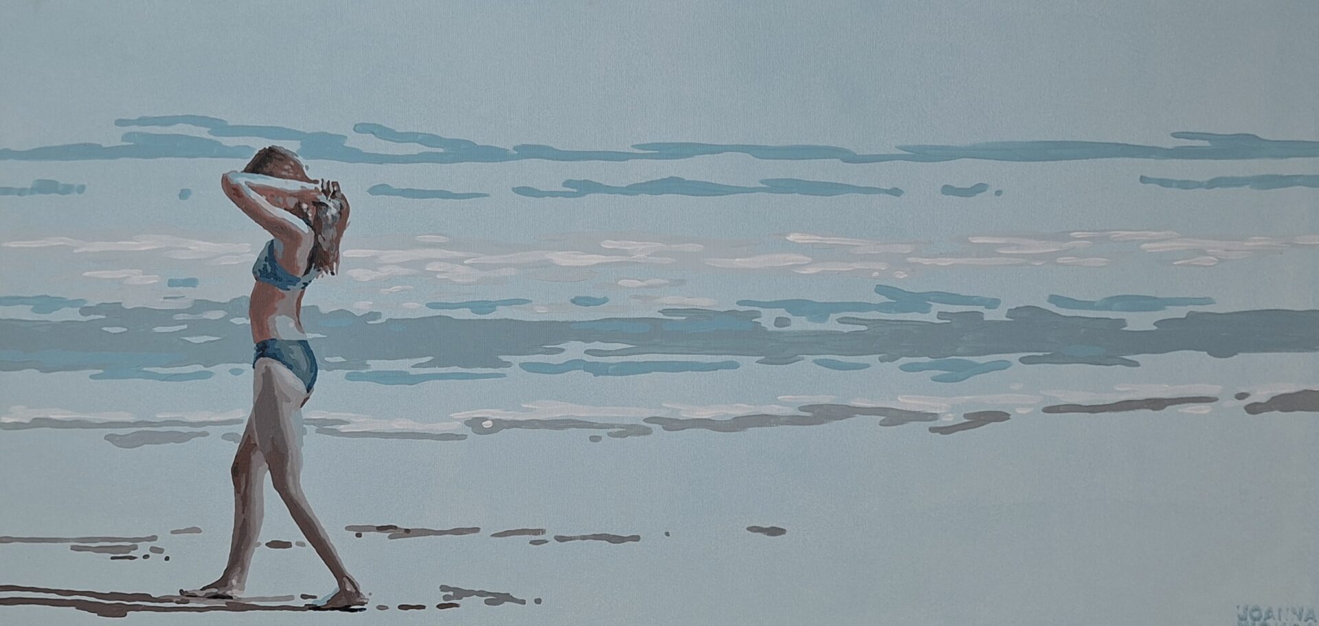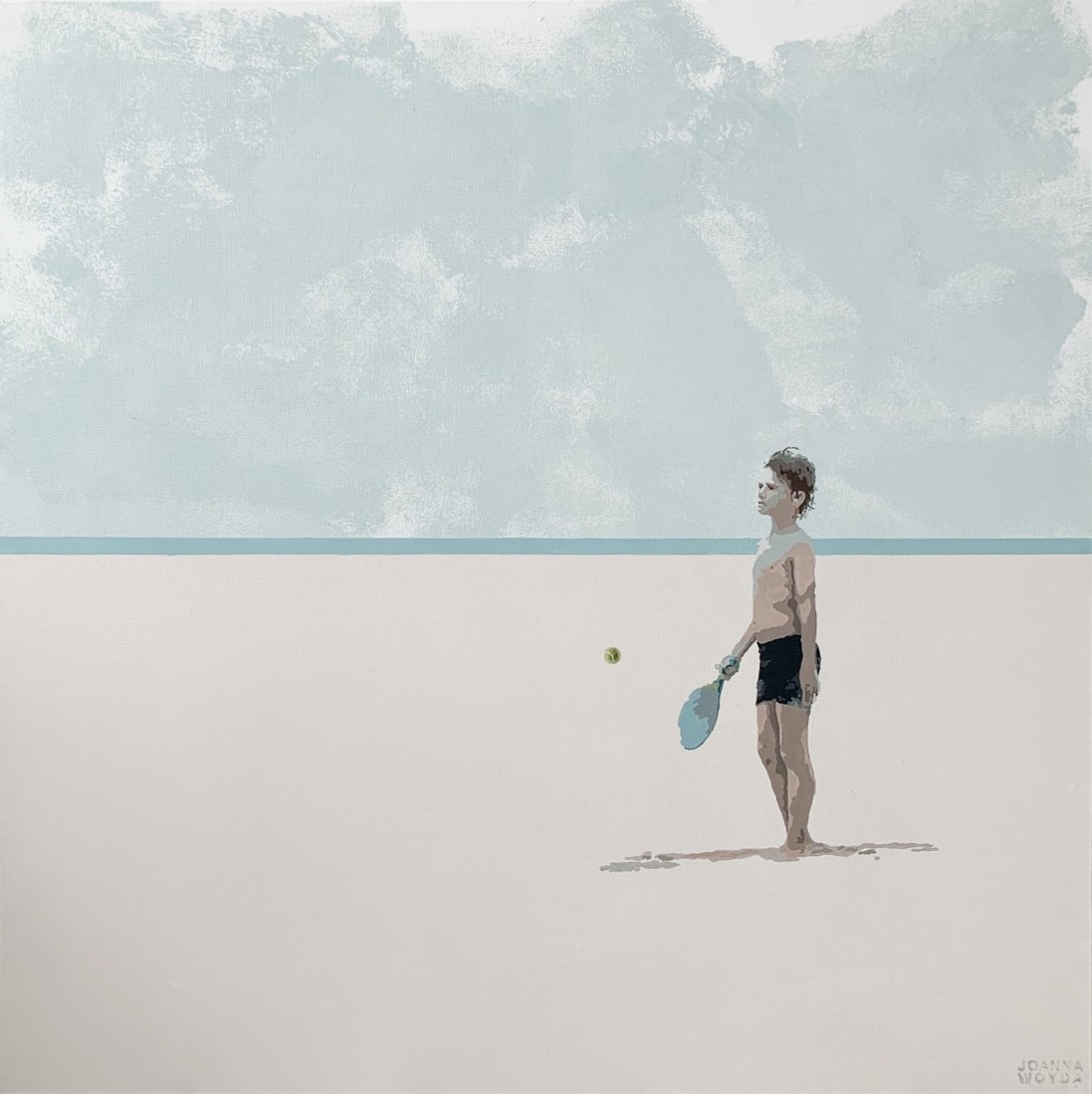 Już przy pierwszej konfrontacji z obrazami Joanny Woydy (ur. w 1981 r.), zatapiając się w ogromnych płaszczyznach błękitu, na których tle rozgrywają się różnorodne sceny, odczuwamy nieopisany spokój. Malarka w swym cyklu obrazów zatytułowanym „Plaża”, który powstaje od 2008 roku i obejmuje ponad 80 płócien, z niemalże fotoreporterską dokładnością dokumentuje zaobserwowane na plaży ludzkie zachowania, zwyczaje, gesty. Woyda jak gdyby bierze pod lupę pojedynczą sytuację – przygląda się spacerującym samotnie osobom, bawiące się dzieciom, biegającym psom; zatrzymuje je w ruchu i umieszcza na niemającej określonego końca płaszczyźnie błękitu. Mimo braku skonkretyzowania owej przestrzeni i pozbawieniu jej jakichkolwiek znaczących elementów, od razu wiadomo, że znajdujemy się na plaży. Jest to bowiem przestrzeń, która wnet przyciąga naszą uwagę, przywołując błogie poczucie ukojenia, spokoju i odpoczynku – tego wszystkiego, za czym w obecnym, będącym w wiecznym pośpiechu świecie, tak bardzo tęsknimy.