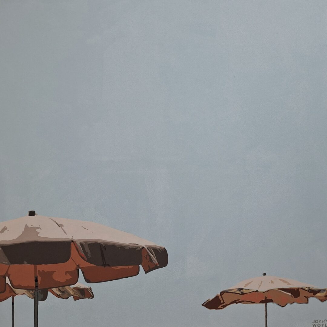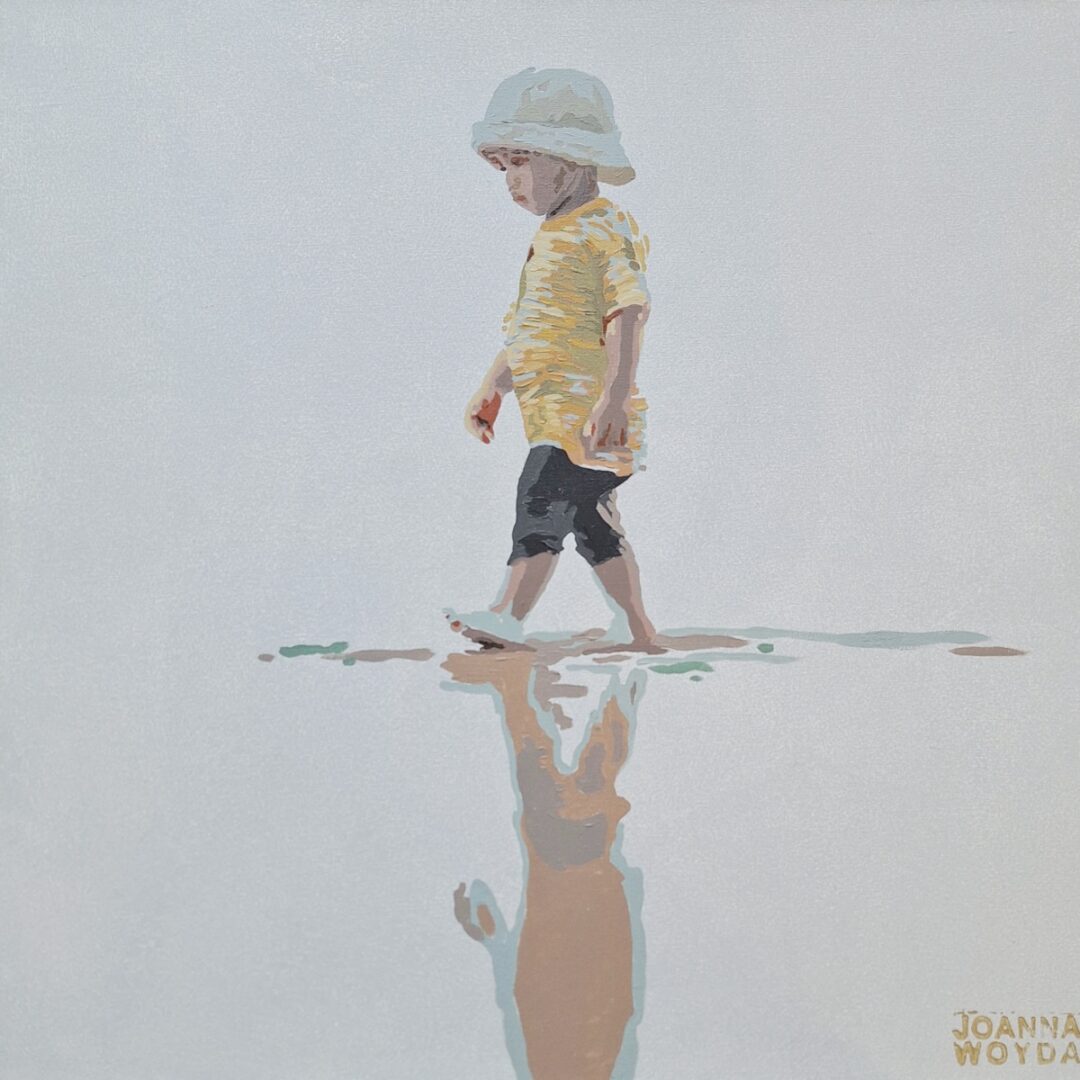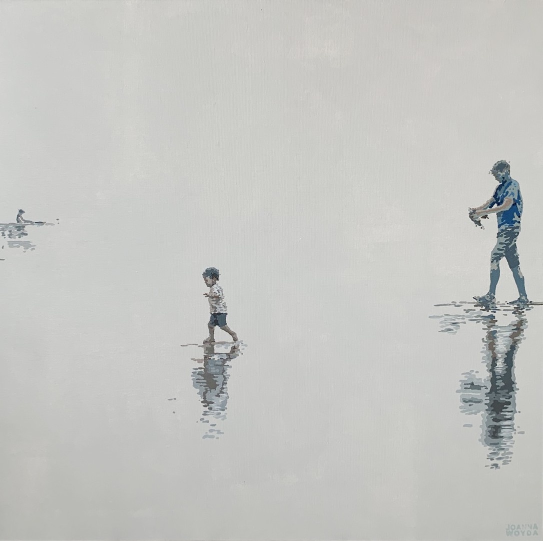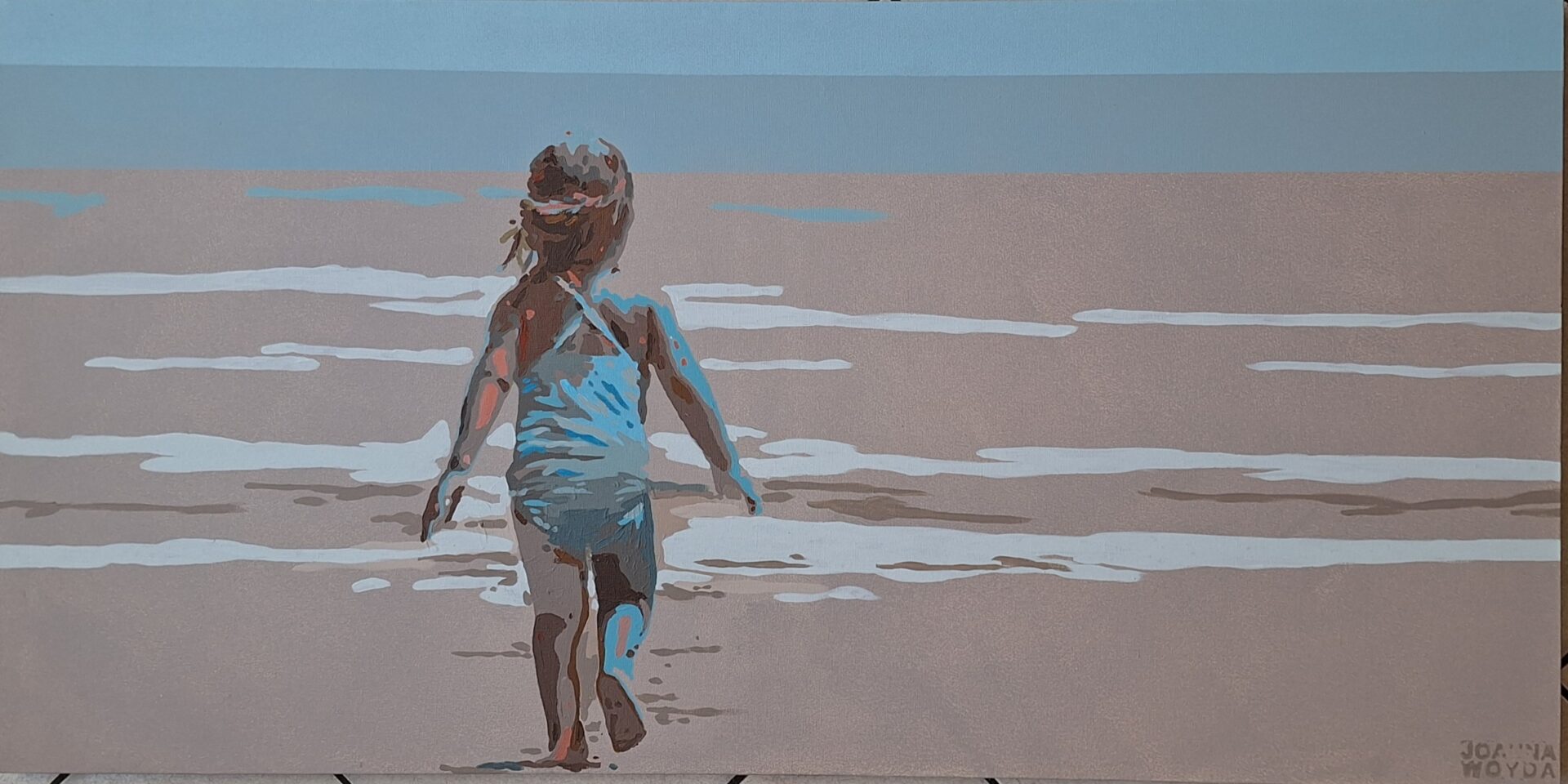 Już przy pierwszej konfrontacji z obrazami Joanny Woydy (ur. w 1981 r.), zatapiając się w ogromnych płaszczyznach błękitu, na których tle rozgrywają się różnorodne sceny, odczuwamy nieopisany spokój. Malarka w swym cyklu obrazów zatytułowanym „Plaża”, który powstaje od 2008 roku i obejmuje ponad 80 płócien, z niemalże fotoreporterską dokładnością dokumentuje zaobserwowane na plaży ludzkie zachowania, zwyczaje, gesty. Woyda jak gdyby bierze pod lupę pojedynczą sytuację – przygląda się spacerującym samotnie osobom, bawiące się dzieciom, biegającym psom; zatrzymuje je w ruchu i umieszcza na niemającej określonego końca płaszczyźnie błękitu. Mimo braku skonkretyzowania owej przestrzeni i pozbawieniu jej jakichkolwiek znaczących elementów, od razu wiadomo, że znajdujemy się na plaży. Jest to bowiem przestrzeń, która wnet przyciąga naszą uwagę, przywołując błogie poczucie ukojenia, spokoju i odpoczynku – tego wszystkiego, za czym w obecnym, będącym w wiecznym pośpiechu świecie, tak bardzo tęsknimy.