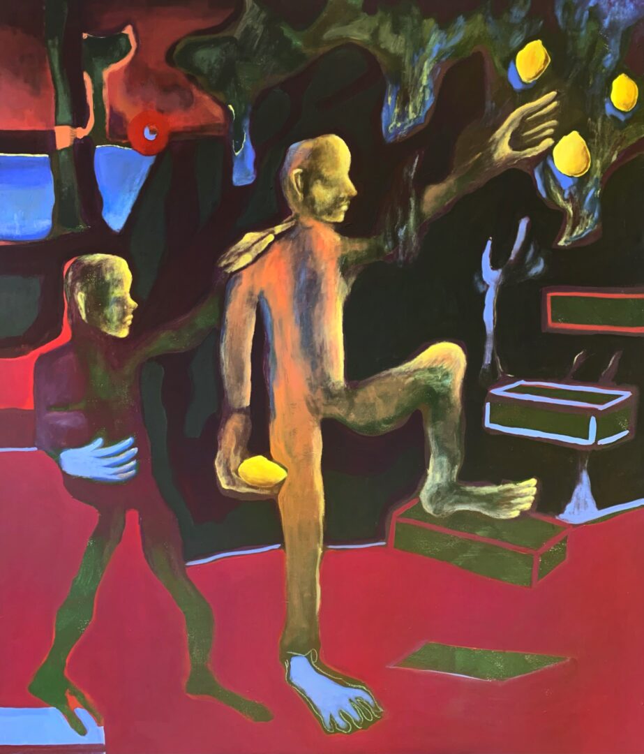 na wystawie: Drzewa cytrynowe (z cyklu ,,Podróże, które nigdy nigdy się nie odbyły”), akryl i pastel, 110×120, 2024