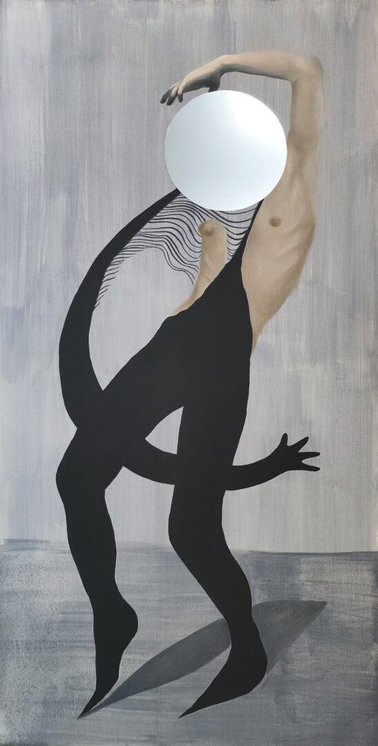 Obraz inspirowany jest plenerowymi rzeźbami Oskara Zięty, które poprzez swoją polerowaną, lustrzaną powierzchnię zniekształcają otoczenie i odbijają postać artysty. Obraz został namalowany na podstawie fotografii wykonanych w ostatnim roku, ukazujących własne odbicie w rzeźbach. Zniekształcone refleksy mają symbolizować odbicie wewnętrznego świata twórcy, który splata się z otoczeniem, tworząc jego dopełnienie. W kompozycji można dostrzec zdeformowane sylwetki, przenikające się przestrzenie i abstrakcyjne formy powstałe w wyniku interakcji światła, metalu i krajobrazu. Malarska interpretacja tych dynamicznych odbić stanowi wyzwanie techniczne, a jednocześnie pozwala na głębszą refleksję nad postrzeganiem własnej tożsamości i relacji z otaczającym światem.