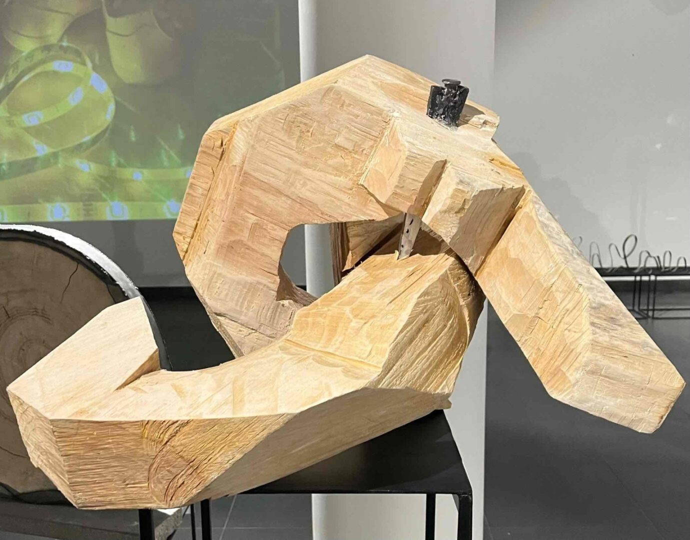 Na wystawie praca: Przekraczanie drewno i metal, ok. 70 x 50 x 60 cm 2024
