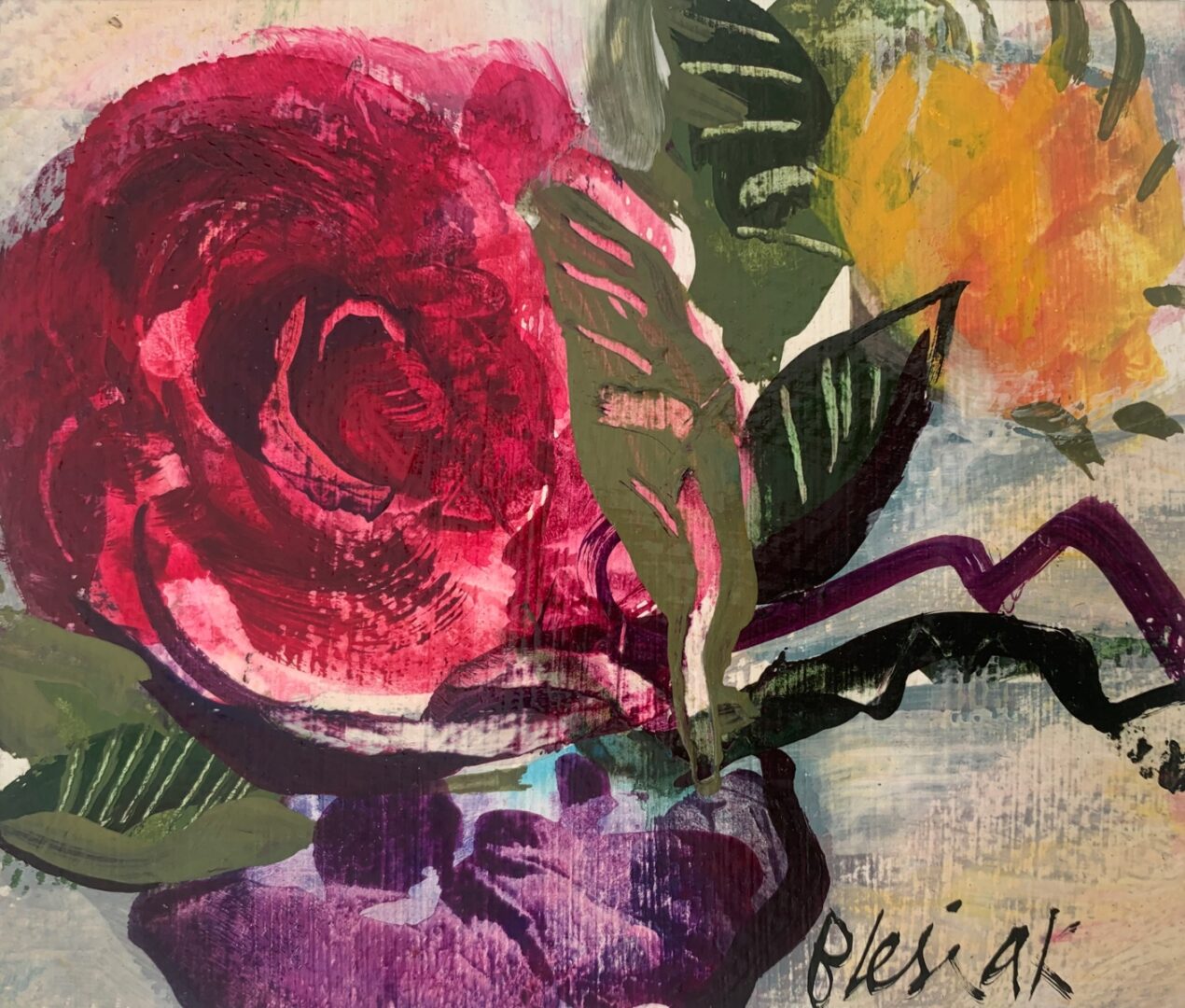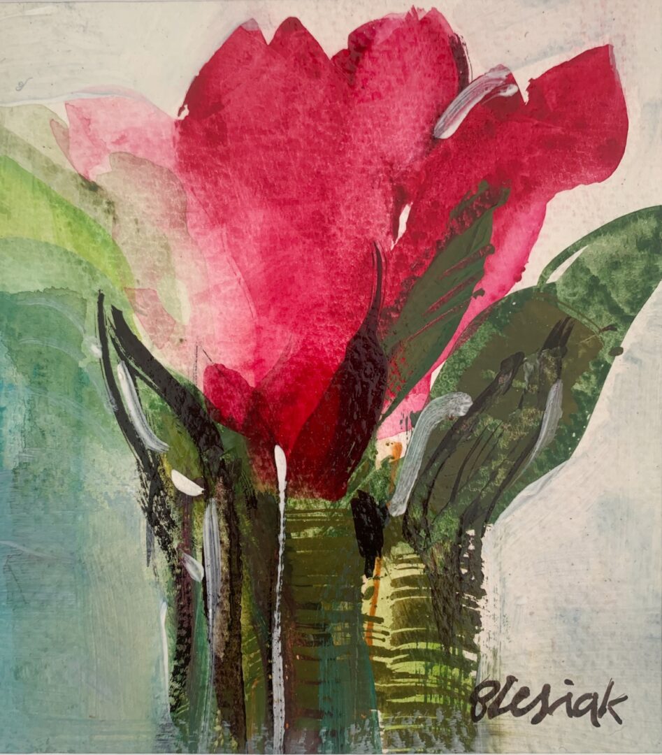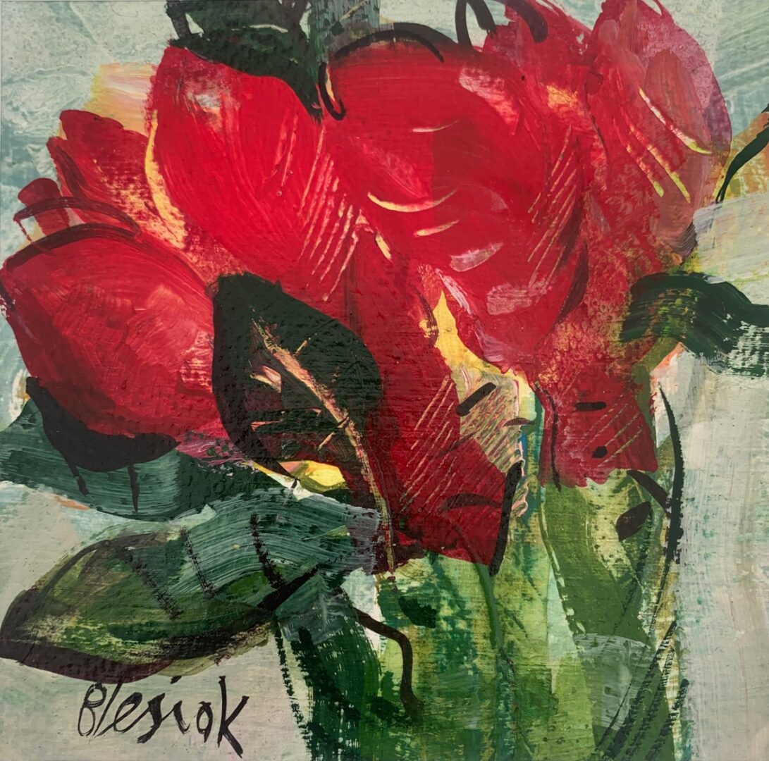 Bożena Lesiak tworzy głownie nastrojowe pejzaże oraz martwe natury z motywem kwiatów.