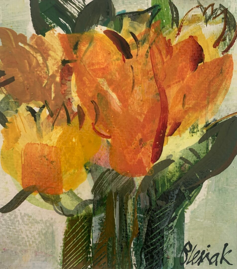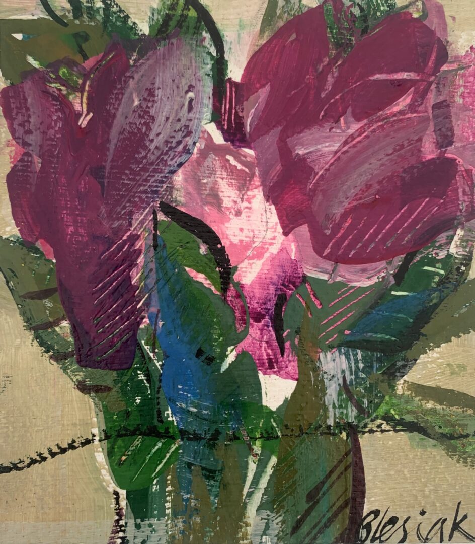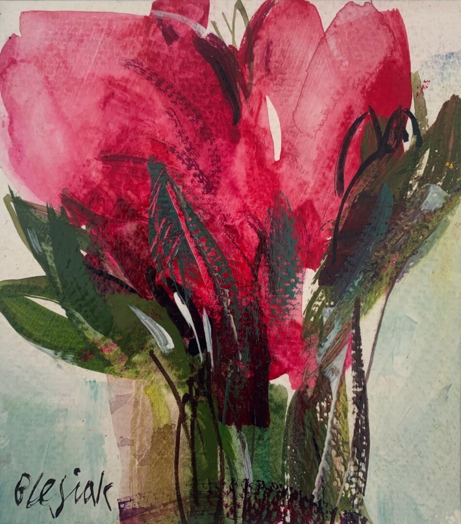 Kwiaty to druga najliczniejsza grupa obrazów; ich uroda wynika z doświadczeń zdobytych w trakcie pracy nad pejzażami. Malowane bukiety budowane są jak krajobrazy, z tą jedynie różnicą, że o ile w tamtych obrazach dominowały układy poziome: smugi wzgórz, łąk, chmur – tutaj dominuje ruch pionowy, wznoszenie się, wzrost. Związane ciasno jak snopki bukiety tulipanów kojarzą się z drzewami, tła, na których je oglądamy, zamieniają się w pełne światła nieba.