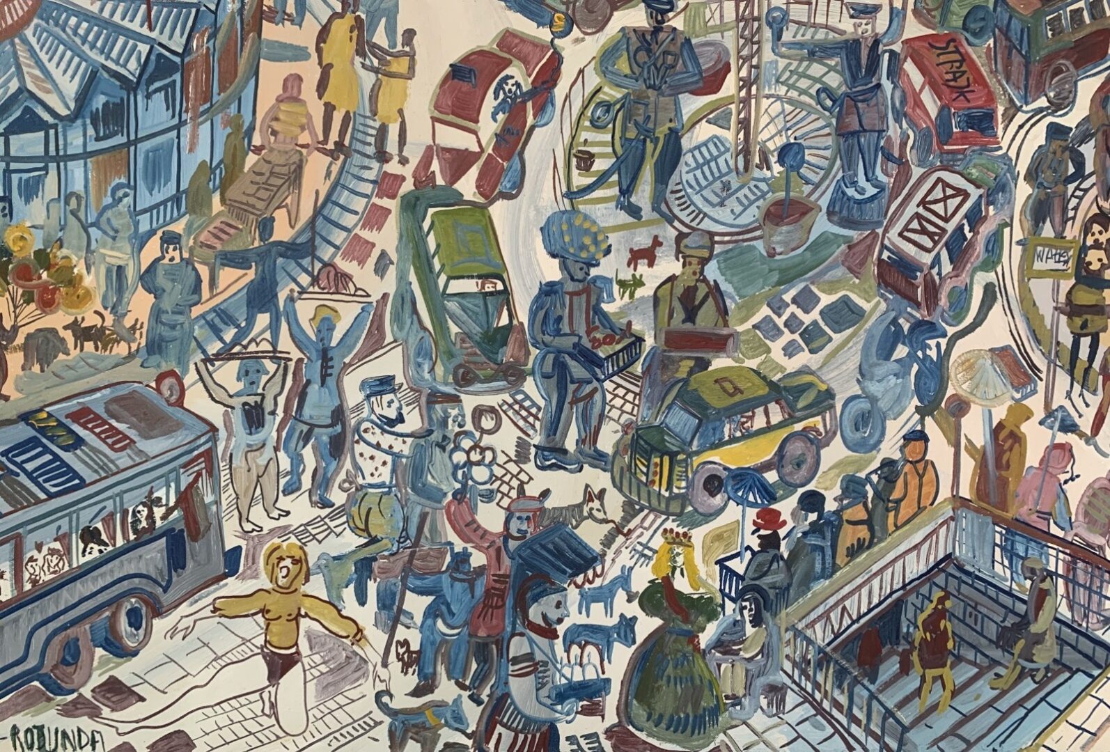 Typowym elementem jest zatłoczenie przestrzeni – widzimy tu ludzką gęstwinę, pojazdy, budynki. Pojawiające się gdzieniegdzie symbole polityczne i banery odzwierciedlają gorącą atmosferę wyborczą tamtego okresu.